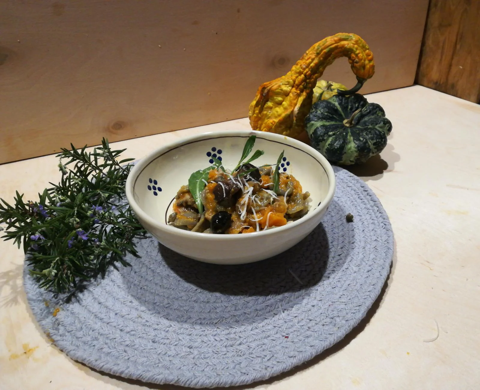 Passiamo a sbucciare la zucca, la tagliamo a cubetti. Prendiamo i cipollotti e li tritiamo, stessa cosa con l'aglio. li mettiamo in una casseruola con un filo d'olio e aggiungiamo la zucca. Prendiamo il rosmarino, lo leghiamo con dello spago e lo aggiungiamo nella casseruola.